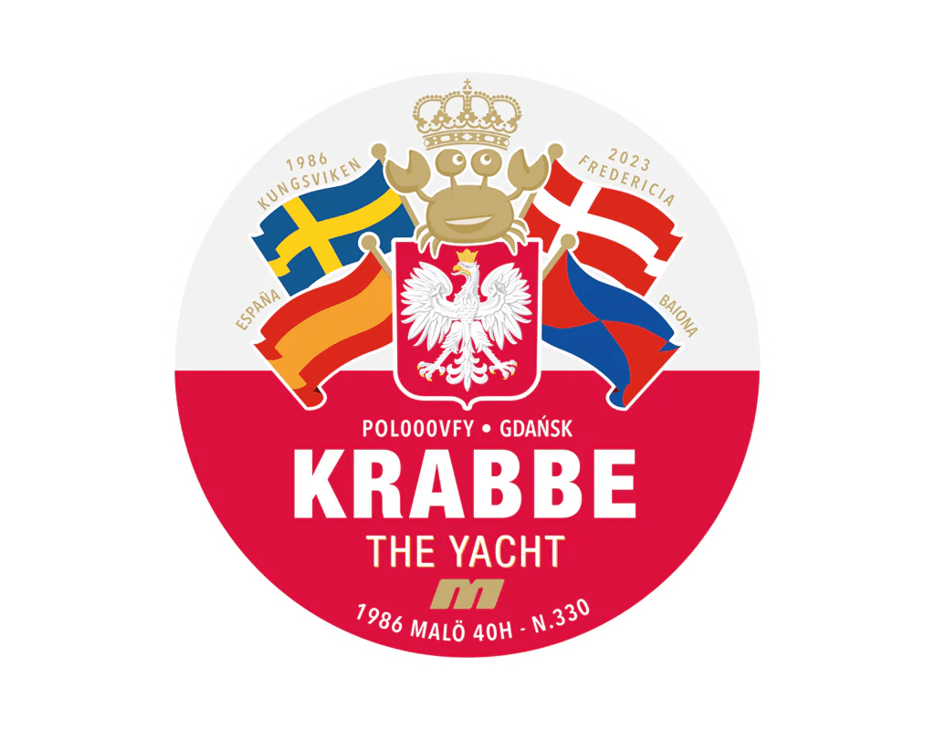 Y es en ese periplo, en ese nombre y en las distintos pabellones bajo los que el «Krabbe» ha navegado, que he diseñado un escudo. Un escudo es algo realmente serio, así que ha de tener un carácter heráldico. Y como la heráldica es una ciencia seria, la divisa que distinguirá al «Krabbe» desde ahora consistirá en un cangrejo coronado, sobre el escudo de Polonia, flanqueado por las banderas de Suecia, su país de nacimiento, Dinamarca, el país en el que se adquirió, España, pues serán las aguas territoriales que navegará con mayor frecuencia, y Baiona, la villa marinera en la que encontrará su fondeadero. Todo el conjunto sobre los colores de la bandera de Polonia, pabellón definitivo de este maravilloso y robusto barco, en el que en breve disfrutaremos, descansaremos, comeremos, dormiremos y, ocasionalmente, sufriremos algún que otro susto.