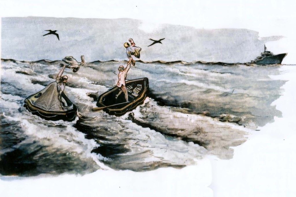 «No sé si realmente se puede imaginar cómo es estar sentado en una balsa salvavidas y que una ballena se acerque tanto que podríamos haberla tocado sin estirarnos. ¡Fue un regalo ver esa ballena a nuestro lado! Y ella no hizo nada; simplemente nos miró con su ojo sin parpadear, directamente a nosotros. Temíamos que un movimiento rápido suyo pudiera volcar nuestra balsa. Se quedó ahí largo tiempo… veinte minutos, media hora… Llegué a conocerla muy bien, luego se fue muy despacio, se deslizó y se zambulló sin salpicar. Fue maravilloso verlo. Y por la noche podíamos oír los cantos de esas ballenas alrededor.»