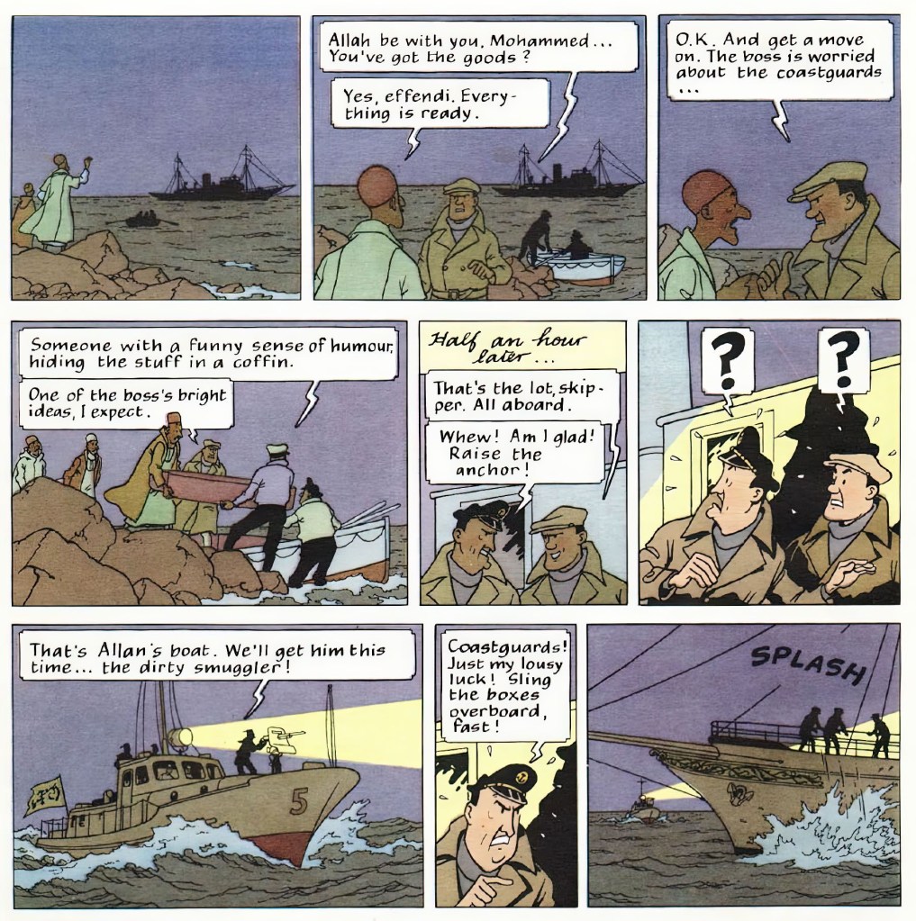En otras aventuras, los barcos no tienen un papel tan destacado, pero casi siempre aparecen en alguna viñeta, ya sea como punto de partida o cierre del relato. Esta presencia constante se ve reforzada por la precisión con la que Hergé dibujaba las embarcaciones, fruto de una exhaustiva labor de documentación. Su rigor técnico aporta realismo y credibilidad al mundo marítimo de Tintín, convirtiendo a los barcos en un elemento fundamental de la serie.