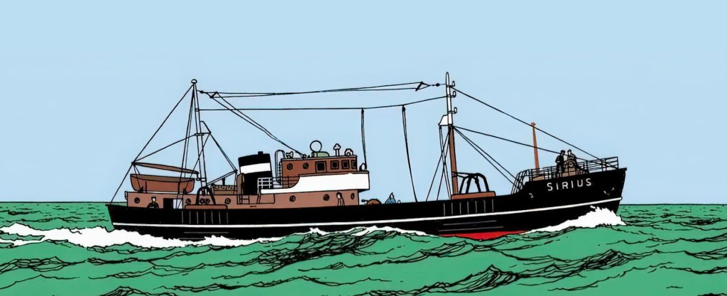 Hergé había leído en el número de octubre de 1938 de la revista «Sur L’Eau» un artículo sobre un arrastrero botado dos años antes para el armador ostendeño Pêcheries à Vapeur. En una carta de un tal D. Pots, publicada entonces en la revista Oostendse Visserijblad, se podía leer: « En 1936, se botó un arrastrero moderno, que no sólo está equipado con los últimos avances técnicos, sino que, con sus líneas de nuevo diseño, ofrece una silueta revolucionaria que despierta la admiración de todos» . Así el Sirius apareció por primera vez en el periódico Le Soir el 20 de enero de 1942. Durante la aventura La Estrella Misteriosa en la escena del reabastecimiento del Aurora.