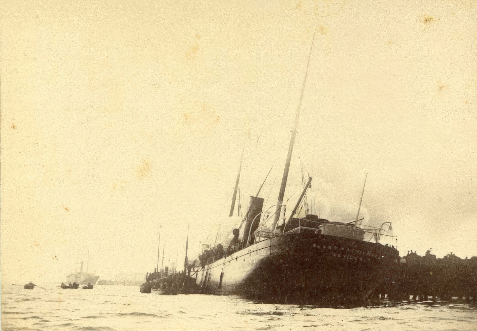 El vapor Cabo Machichaco en llamas antes de la primera explosión. Imagen tomada por el fotógrafo local Pablo Isidro Duomarco.